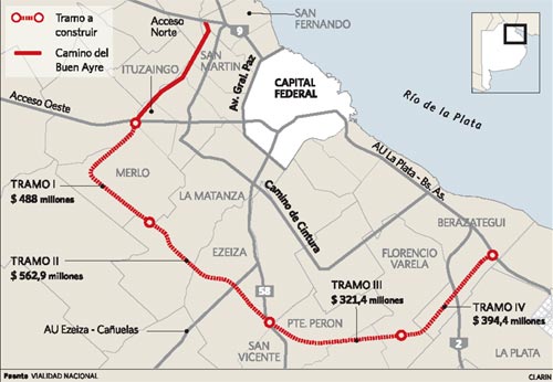 La autovía Presidente Perón, será la continuacion del camino del Buen ayre,  tendrá 117 kilómetros y conectará el Acceso Norte, Acceso Oeste, Autopista Riccheri y la Autopista Buenos Aires La Plata. Conectará a 14 municipios del Conurbano: San Isidro, San Martín, Tres de Febrero, Hurlingham, San Miguel, Ituzaingó, Merlo, La Matanza, Ezeiza, Presidente Perón, San Vicente, Florencio Varela, Berazategui, La Plata y Ensenada. Esta área, habitada por 13 millones de personas, se verá beneficiada con un eficiente transporte de automóviles y camiones del conjunto de la región.