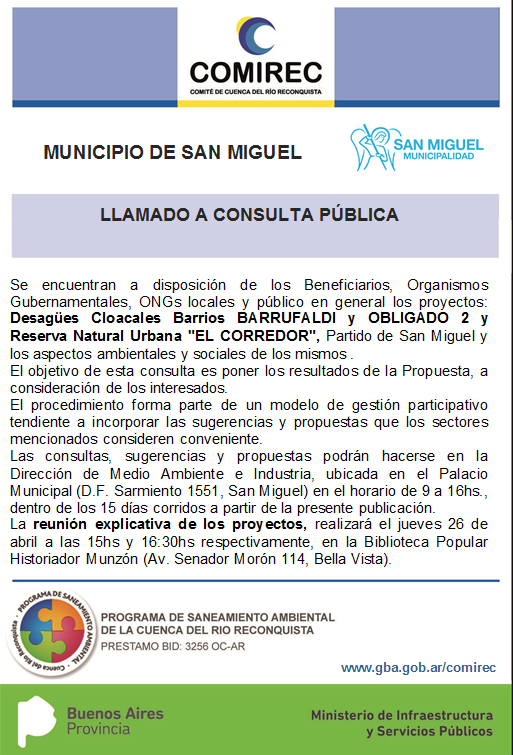 El COMIREC,  Comité de Cuenca del Rio Reconquista  lanzó una consulta abierta al público en general para la construcción de tres proyectos, el de desagües cloacales de barrio Barrufaldi, el de Obligado 2 y la Reserva Natural  “El Corredor”.