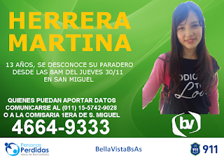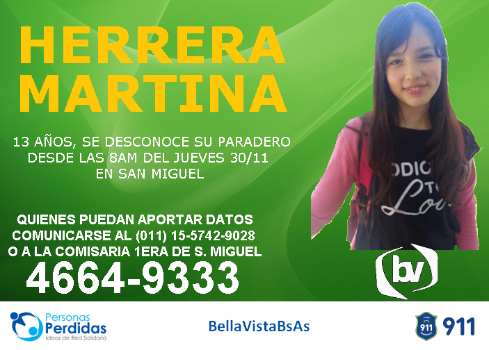 ATENCIÓN: Se solicita la colaboración de la población para dar con el paradero de la niña MARTINA HERRERA, de 13 años de edad quien se encuentra desaparecida desde el dia jueves 30 de noviembre a las 8am. La ultima vez que se la vió se encontraba en la calle Jose Maria Paz al 1400 se dirigía hacia su escuela con un delantal blanco. Quienes puedan suministrar datos por favor comunicarse a la Comisaria 1era de San Miguel al 4664-9333 o al telefono de la familia al 15-5742-9028, muchas gracias